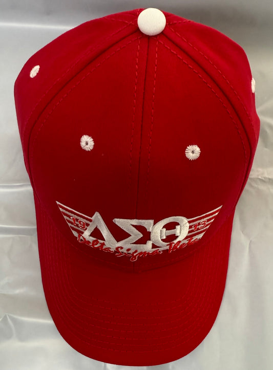 DST-RED WITH WHITE EYELETS BASEBALL-WHITE BORDER UNDER FRONT LID CAP-FLEX FIT with WHITE DST LETTERS/RED DST SCRIPT/RED 1913/RED-WHITE PATTERN ON THE SIDES-GW1096